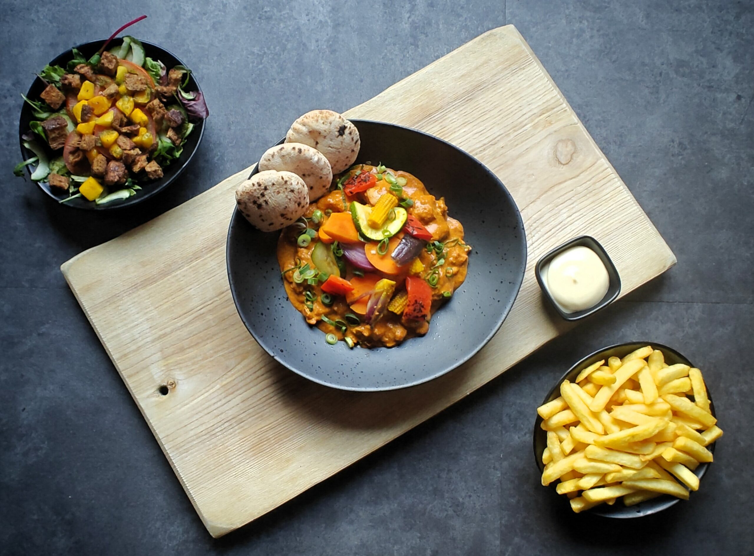 Geserveerd met salade, frites & een bakje mayonaise