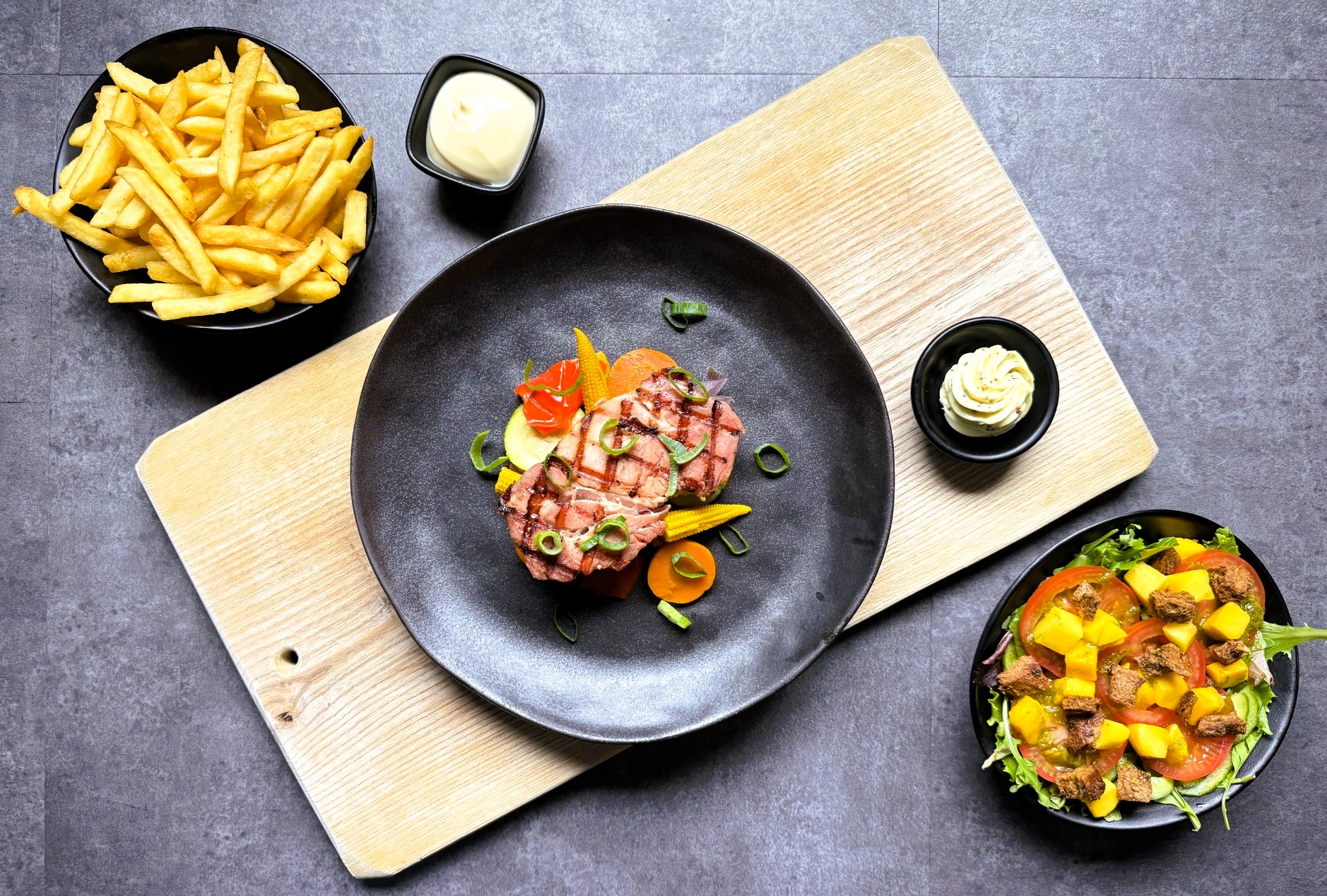Geserveerd met salade, frites & een bakje mayonaise