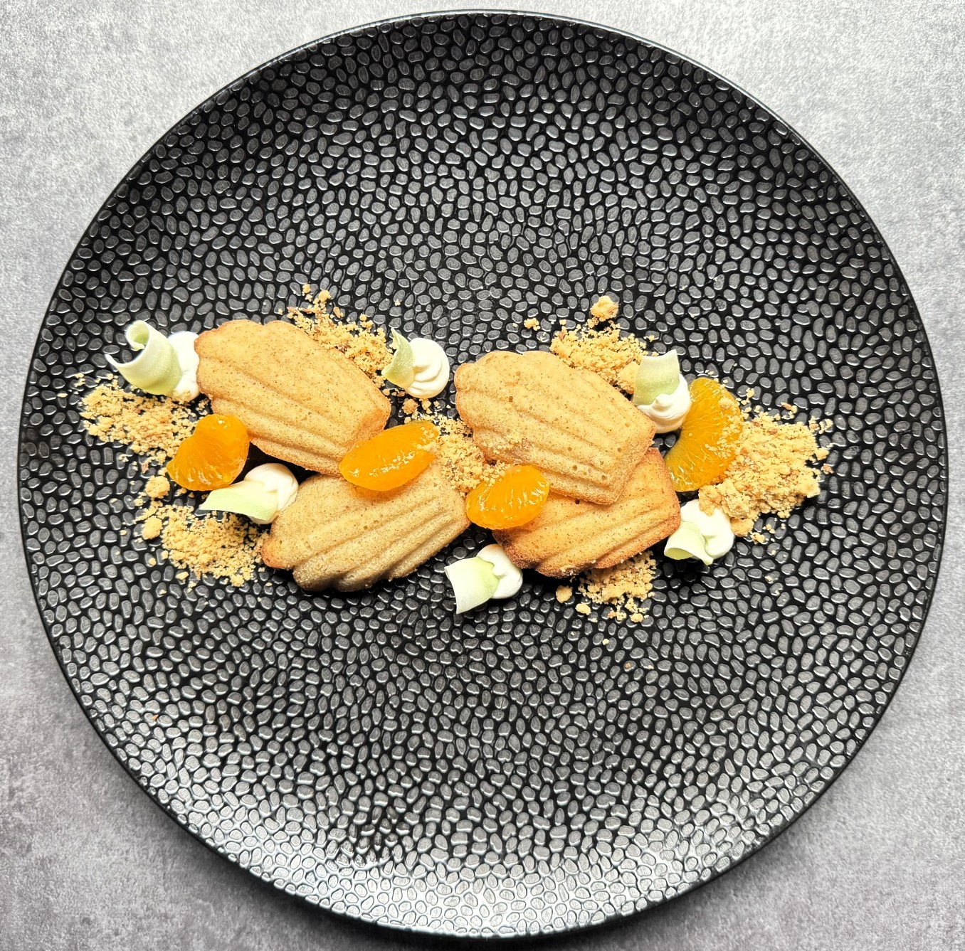Madeleines met anijs, crumble van gestampte muisjes en mandarijn partjes.