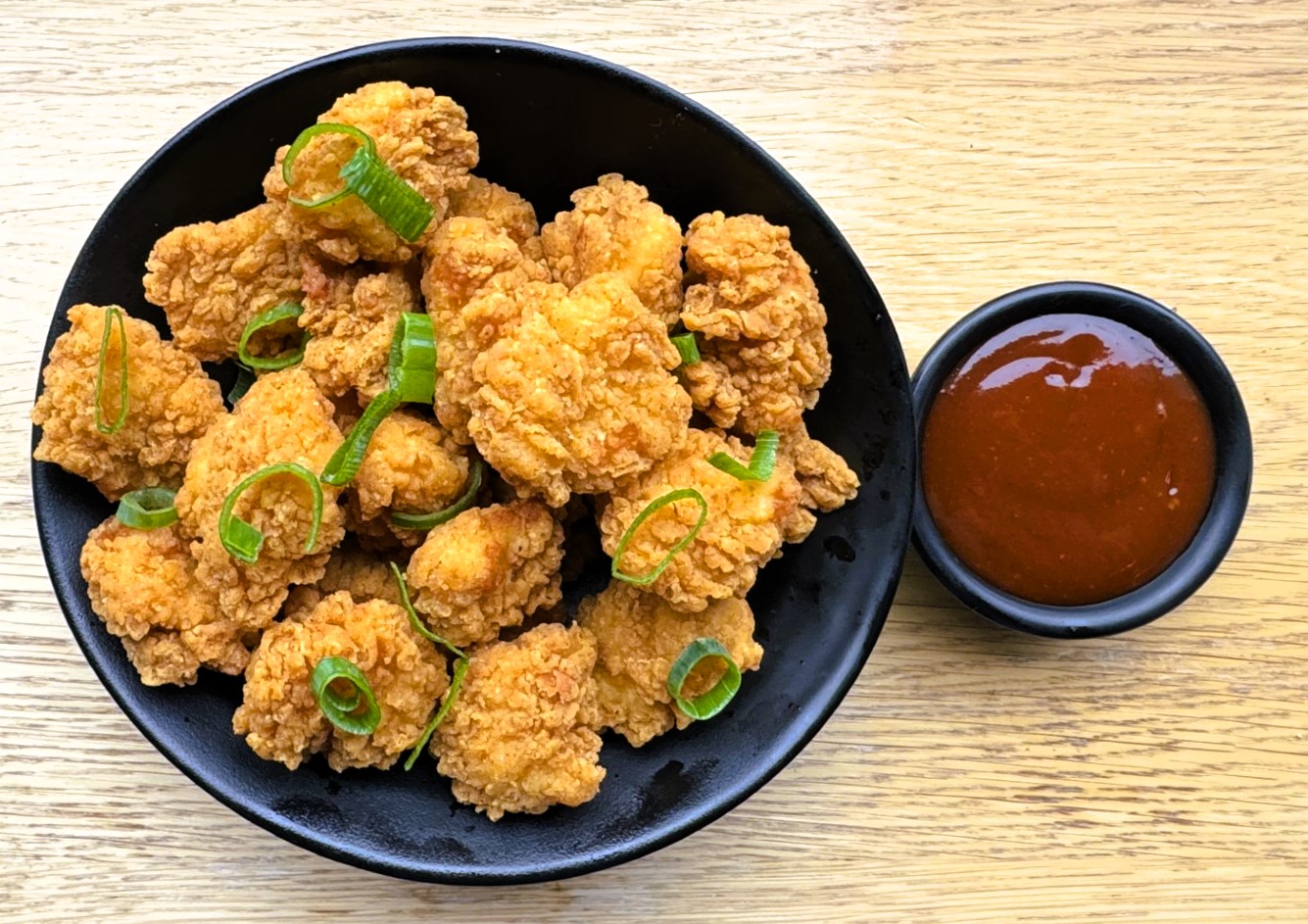 Knapperige popcorn chicken bites geserveerd met een zoete chilidip.