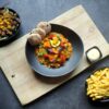 Rode curry geserveerd met rijst, geroosterde groenten, kikkererwten en pita broodjes.