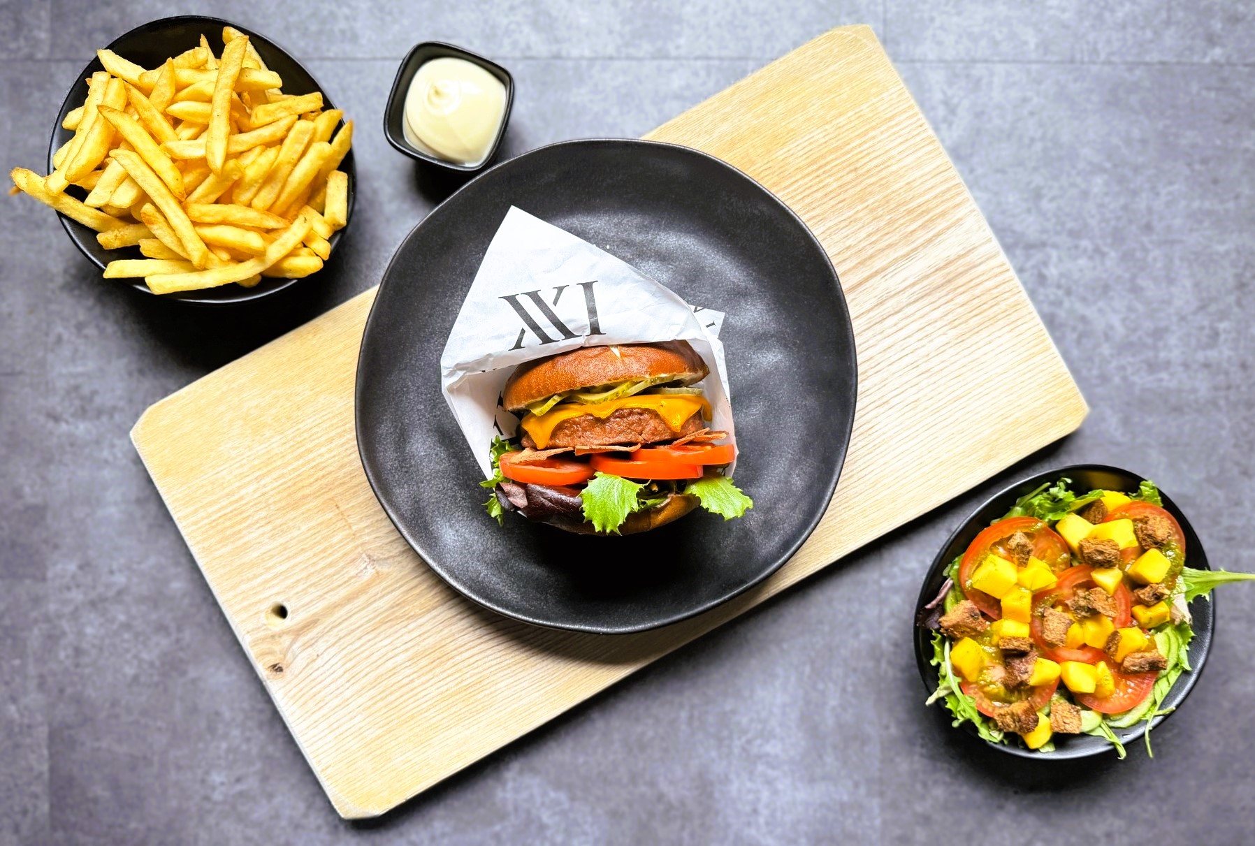 Vegan burger (160g) geserveerd op vegan brioche broodjes met sla, tomaat, rode ui, vegan cheddar en vegan mayonaise.